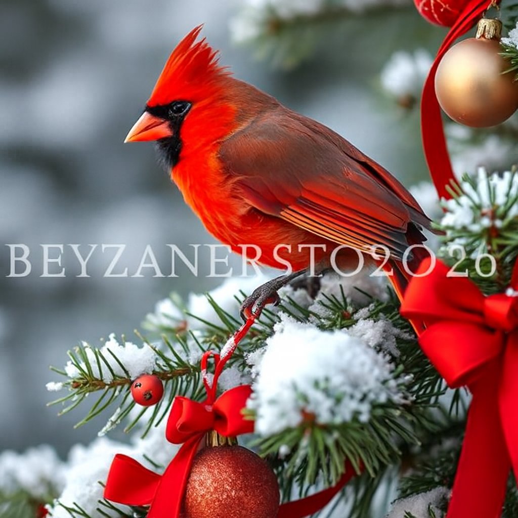 A vivid red cardinal perches among snow‑kissed evergreen branches, surrounded by festive ornaments and soft winter light. This digital artwork blends natural beauty with classic holiday charm, creating a peaceful scene perfect for Christmas décor, greeting cards, wall art, or seasonal gifts. The bright red plumage against deep green needles adds a striking pop of color that feels both cozy and magical.