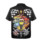 Style: Short-sleeve button-up with bold, full-back automotive artwork