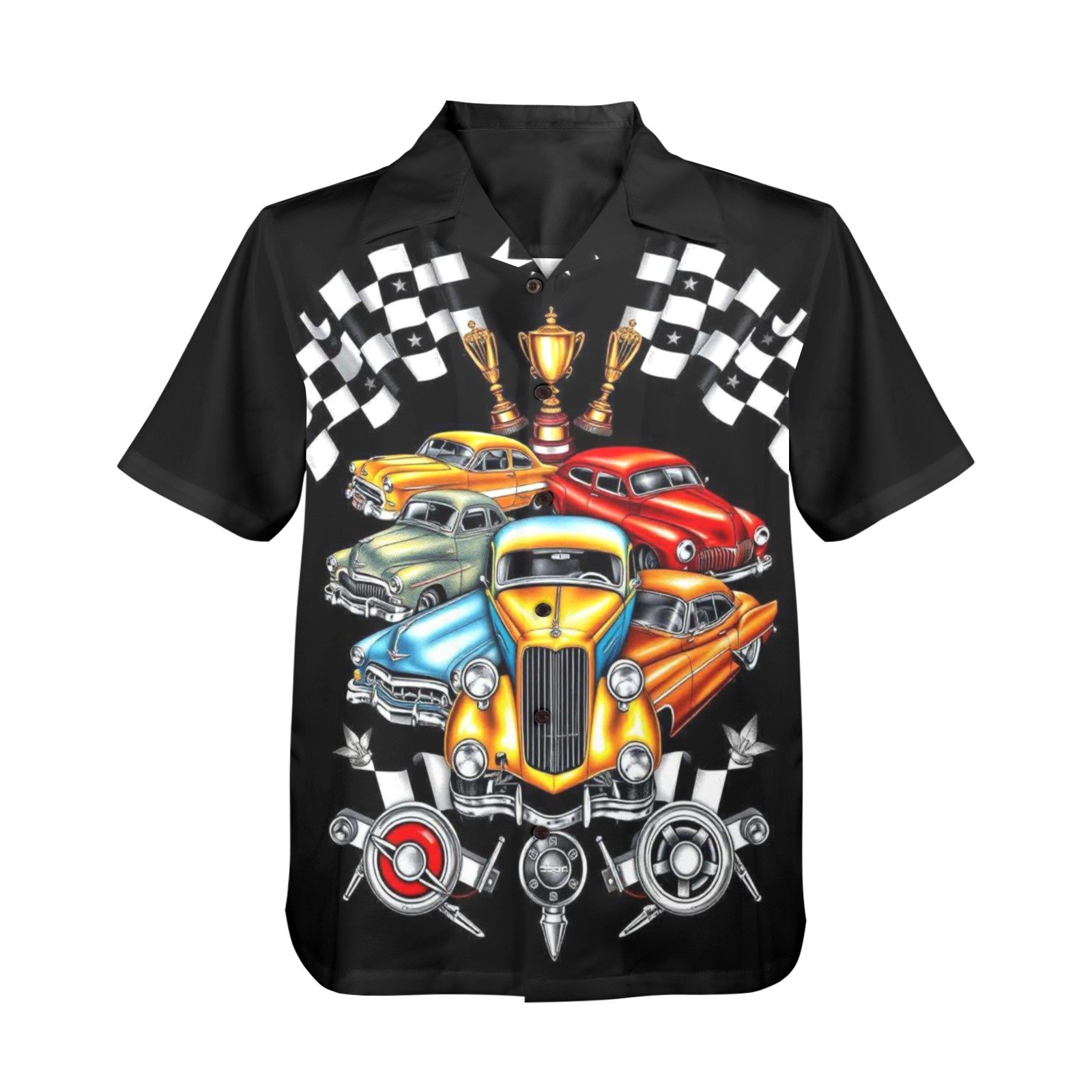 Shift your style into high gear with this statement-making Hawaiian shirt, built for CHECKERED PAST and designed to turn heads. Featuring a vivid all-over print of vintage hot rods, racing flags, and trophy icons, this shirt celebrates the golden age of speed with a tropical twist. Whether you're at work, on vacation, or just kicking back, it’s the perfect fusion of laid-back cool and retro horsepower.