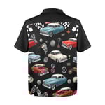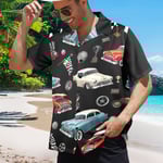 Style: Short-sleeve button-up with bold, full-back automotive artwork