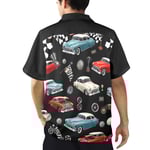 Fuel your style with vintage flair. This bold Hawaiian shirt features an all-over print of classic cars, trophies, checkered flags, and retro racing icons—perfect for the man who lives life laid back with old school values. Whether you're cruising the boulevard or kicking back at a backyard BBQ, this shirt brings nostalgic horsepower to your wardrobe.