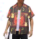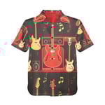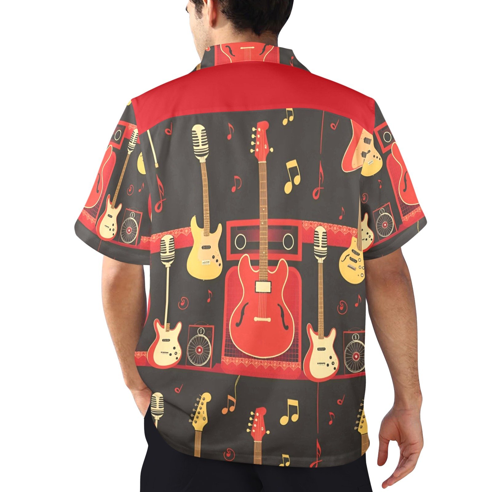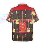 Turn up the volume on your wardrobe with this bold and vibrant Hawaiian shirt, GUITAR STORE, designed for music lovers who arenât afraid to make a statement. Featuring an all-over print of electric guitars, microphones, speakers, and musical notes on a sleek dark background, this shirt is a tribute to rock 'n' roll style. The red inner collar lining adds a pop of contrast that amps up the attitude.