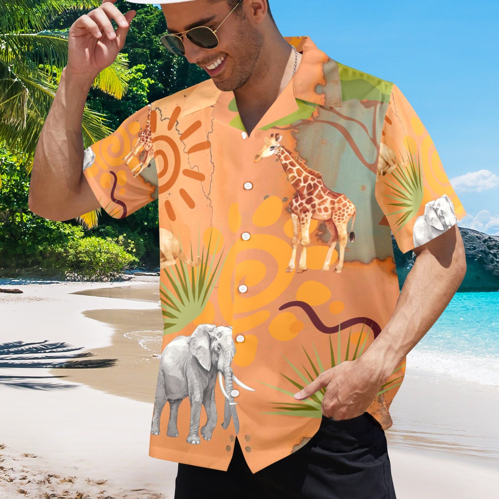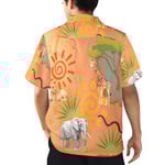 Step into the wild with this vibrant SAFARI-themed Hawaiian shirt, designed for men who love bold style and effortless comfort. Featuring an all-over print of majestic African wildlife—giraffes, elephants, sun motifs, and lush palm leaves—set against a warm watercolor-inspired backdrop, this shirt brings adventure to everyday wear.