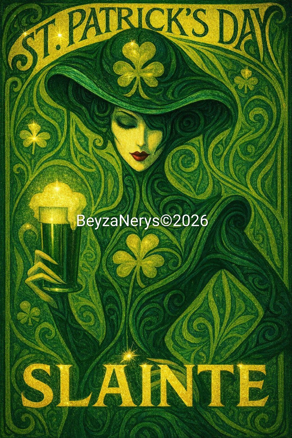A festive, emerald‑rich illustration celebrating Irish spirit, good cheer, and the timeless toast Sláinte (“to your health”).