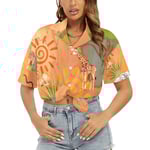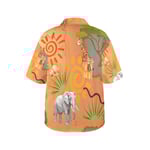 Celebrate your wild side with this eye-catching SAFARI Hawaiian shirt, designed for women who love color, comfort, and adventure. Featuring a vivid all-over print of African wildlife—elephants, giraffes, sun motifs, and lush foliage—set against a warm savanna-inspired backdrop, this shirt brings nature’s magic to your everyday wardrobe.